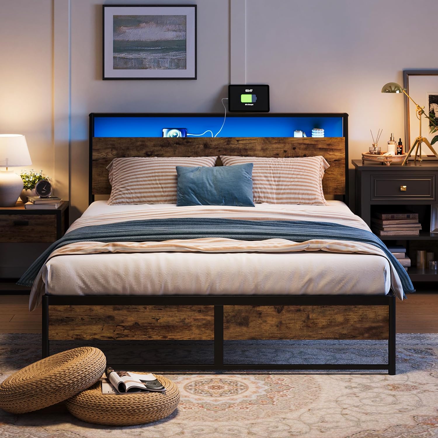 - 3-tier Shelves with Charging Station – Built-in 2 * 5V/2A DC & 1* 125V/12A DC, convenient for you to charge your phones within easy reach when you are lying on the bed. The headboard of our full bed frame also has 3-tier storage shelves for storing books, decorations, a clock, or some private stuffs, which is convenient and practical.