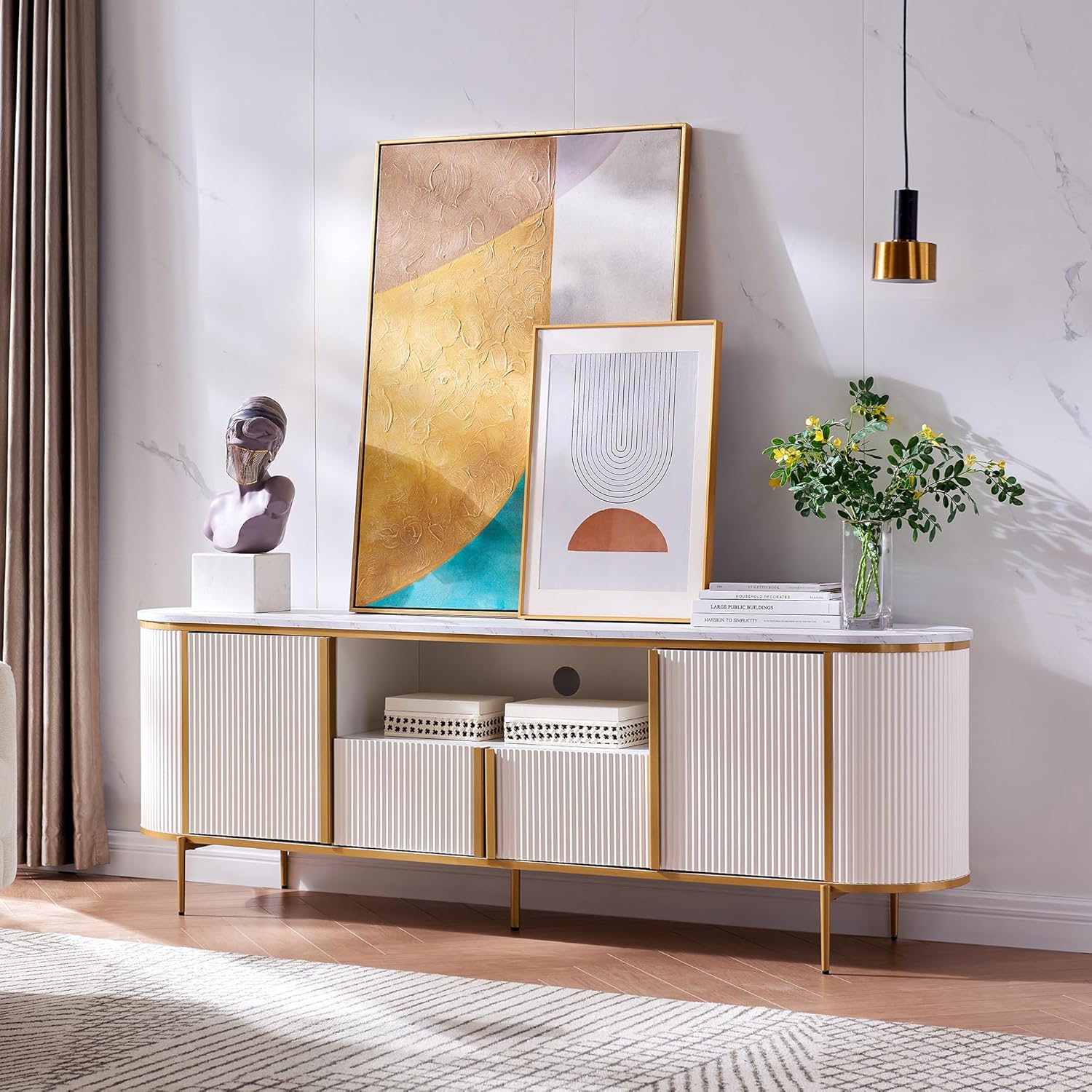 - 70 “LARGE LUXURY TV STAND – The distinctive wave-like fluted panel and Curved Profile Design makes it can be effortless paired with other modern furniture styles. The white/dark blue faux marble top replicates natural marble patterns, maintaining a sense of luxury while reducing weight. Golden metal accents add a touch of visual opulence, and the warm golden tones bring a cozy atmosphere to the room, making it your ideal modern luxury piece for the living room.
